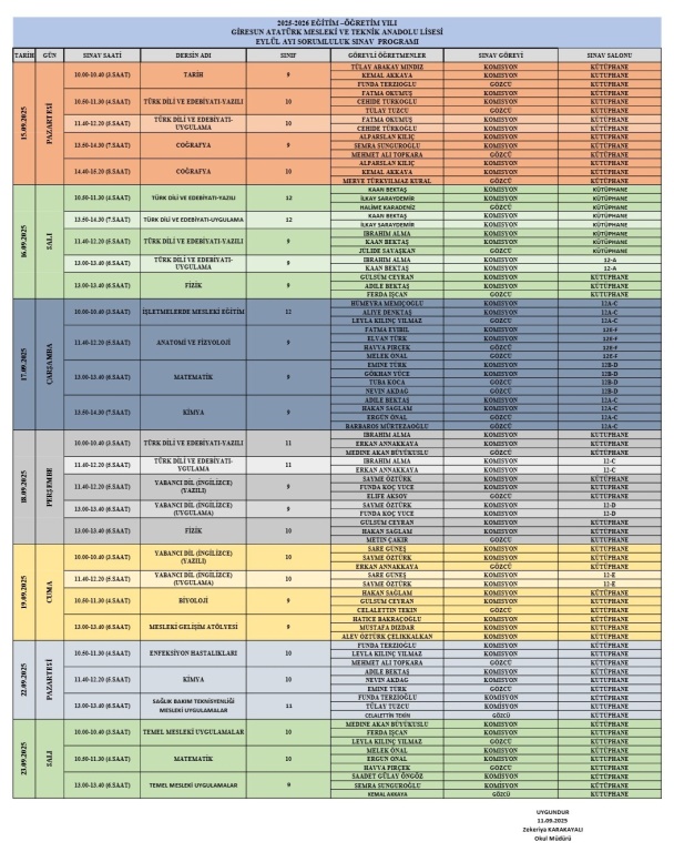 2025-2026 EĞİTİM ÖĞRETİM YILI EYLÜL DÖNEMİ SORUMLULUK SINAV PROGRAMI AŞAĞIDA BELİRTİLEN TARİHLERDE YAPILACAKTIR. ÖĞRENCİLERİMİZİN SINAV SAATİNDEN ÖNCE SINAV SALONUNDA HAZIR BULUNMALARI ÖNEMLE RİCA OLUNUR. SORUMLULUK DERSİ BULUNAN ÖĞRENCİ LİSTESİ VE SORUMLU OLDUĞU DERSLER BAĞLANTIDA YER ALAMAKTADIR.